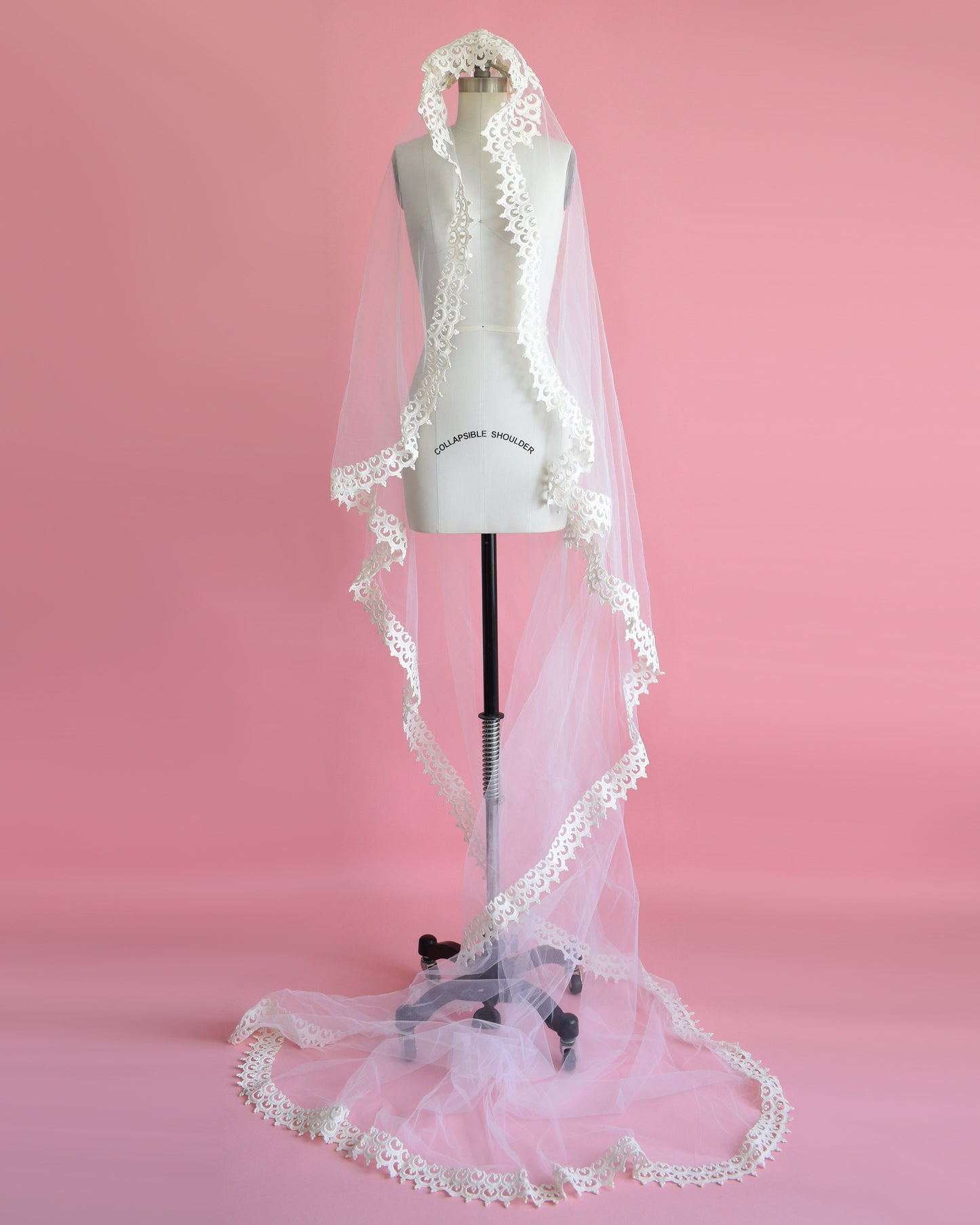 The set comes with a long veil and slip; the veil with three hair combs, and the slip with three layers of acetate/tulle. Hook closure at the back and the slip is believed to be 1950s. All found in a box from 6/6/1971.