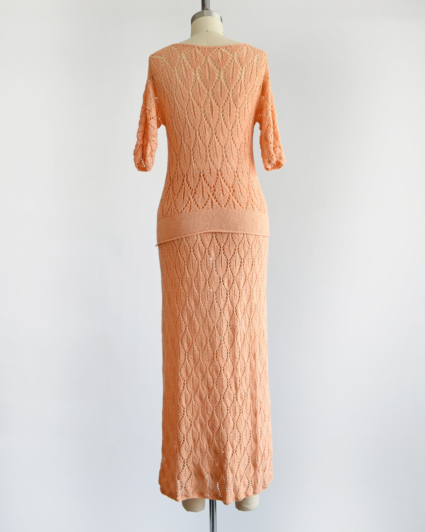 Cute vintage 1960s sweater dress set. This peach two piece set has a pointelle knit sweater and matching maxi skirt. The sweater has boatneck neckline and half sleeves. The skirt has an elastic waist that stretches. Since the knit is open, the pieces may require a garment underneath. The material is soft and has some stretch. There are no closures to either of the garments. Belt not included.