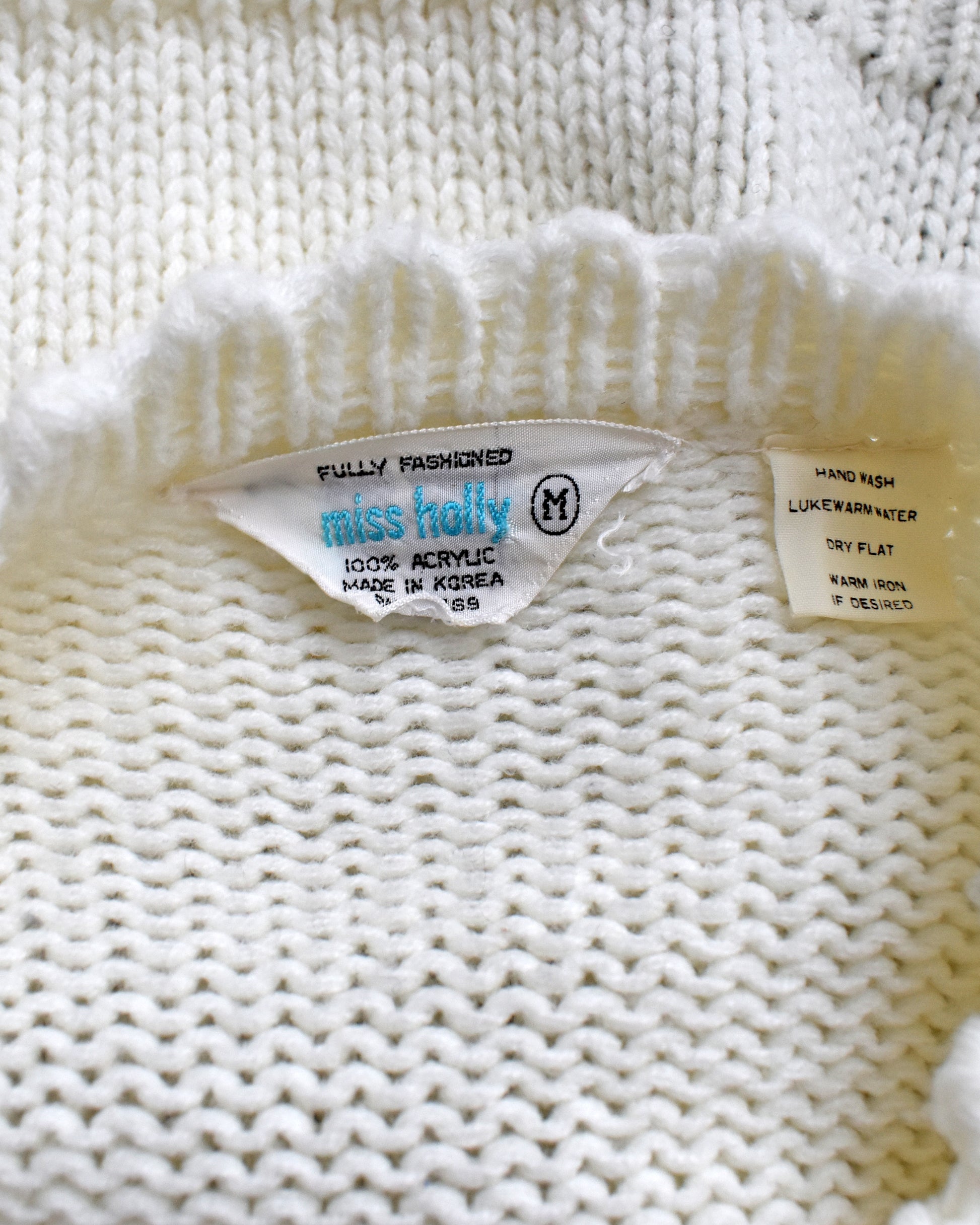 Adorable vintage 1960s floral cardigan. Soft white acrylic knit with colorful floral crewel embroidery on the front. Scallop trim along the collar and down the front. Ribbing on the collar, down the front, cuffs and hem. Raglan style sleeves. Two hook closures at the neck. Unlined. The material has some stretch.